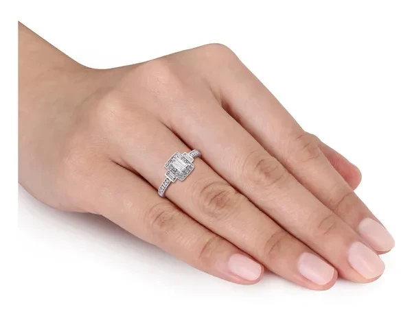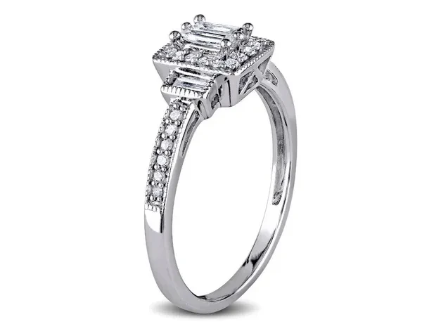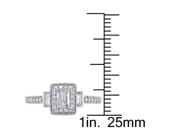 1/3 Carat (ctw G-H, I2-I3) Diamond Engagement Ring in 10K White Gold Let this exquisite Baguette- and Round-Cut Diamond Engagement Ring symbolize your love. Two fiery baguette-cut, prong-set diamonds haloed by 14 sparkling round-cut, pave-set diamonds are the 10 karat white gold ring's focal point, while two baguette-cut, prong-set side diamonds and 14 round-cut, pave-set diamonds along the band lend an added shimmer. Beautifully crafted in 10k white gold with a Polished Finish Stone Type: Diamond; Color: G-H; Clarity: I2-I3; 0.11 CTW; Quantity: 2; Baguette Cut; Rectangular Shape; Natural; Prong Setting Stone Type: Diamond; Color: G-H; Clarity: I2-I3; 0.07 CTW; Quantity: 2; Baguette Cut; Rectangular Shape; Natural; Bezel Setting Diamond is the Birthstone for the Month of April This Diamond Engagement Ring is the perfect gift for any bridal engagement, birthday, anniversary, holidays, thank you, thinking of you, or for any reason at all SKU: 08DLG1001722-P
