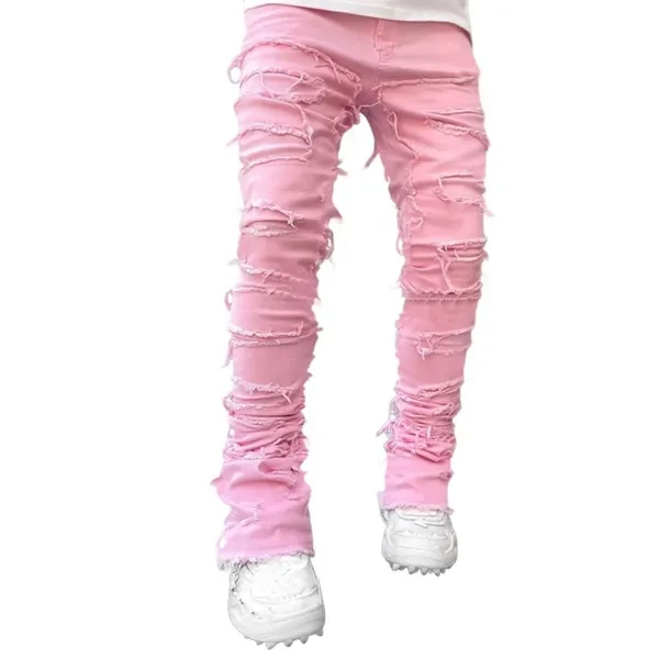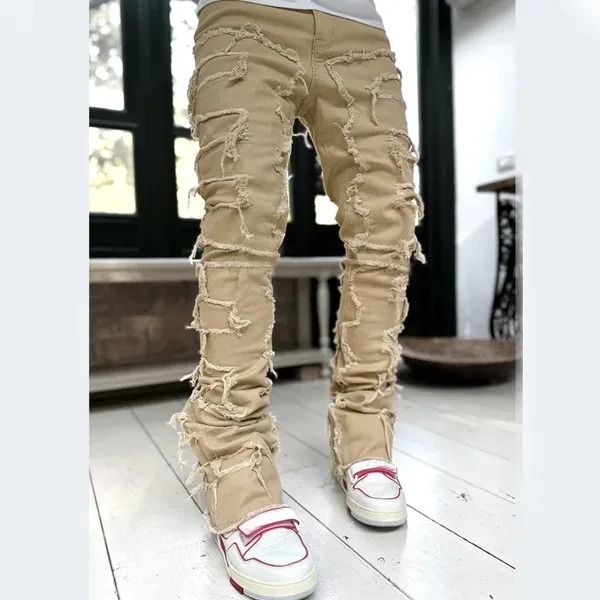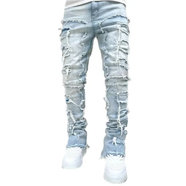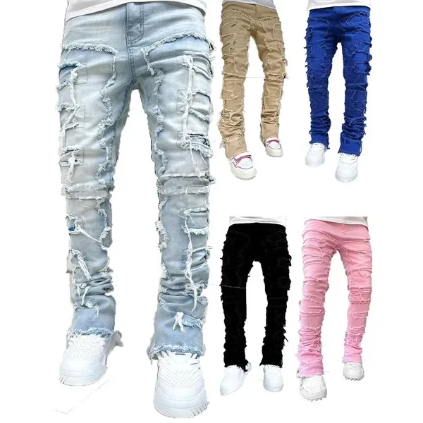 1pc Men's Distressed Ripped Patches Jeans Straight Leg Fit Elastic Denims Pants Hiphop Stretchy Jean Trousers Gifts ACR