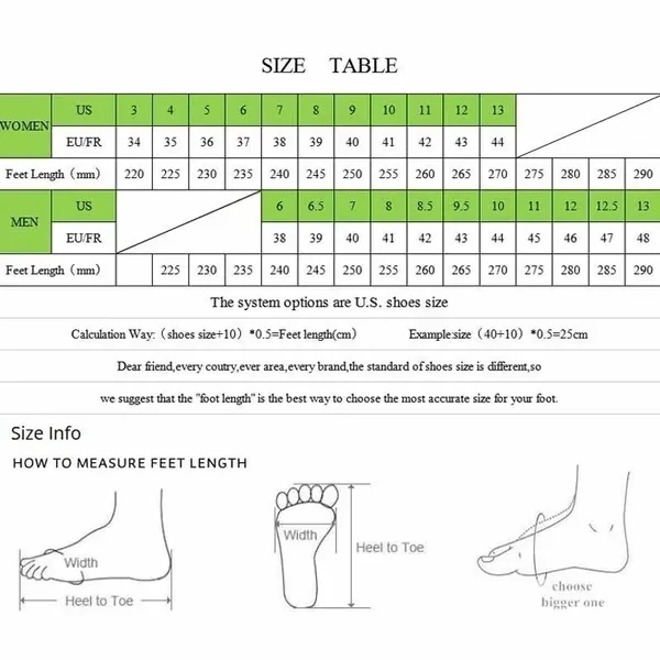 ATTENTION 1 Our size is not standard US/UK/EU size, and it is only equal to foot length! 2 Please carefully read the size table, select right size Size: 3 US Women--34 EU-- 22cm (Foot Length) 4 US Women--35 EU-- 22.5cm (Foot Length) 5 US Women --36 EU-- 23cm (Foot Length) 6 US Women--37 EU-- 23.5cm (Foot Length) 7 US Women--38 EU-- 24cm (Foot Length) 8 US Women--39 EU-- 24.5cm (Foot Length) 9 US Women--40 EU-- 25cm (Foot Length) 10 US Women --41 EU-- 25.5cm (Foot Length) 11 US Women--42 EU-- 26cm (Foot Length) 12 US Women--43 EU-- 26.5cm (Foot Length) Package included:1pair shoes Conversion:1inch=2.54cm,1cm=0.39in if you do not know how to choose the size,welcome to contact with us.any problem,contact with us.