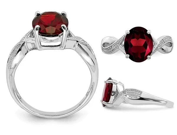 2.50 Carat (ctw) Oval Red Garnet Ring in Sterling Silver A beautiful oval shaped rich red garnet gemstone is prong set in sleek sterling silver making this stunning ring the birthstone of January the perfect match to any outfit. Beautifully crafted in rhodium plated 0.925 sterling silver with a Rhodium plating Finish Stone Type: Garnet; Color: Red; 2.50 CTW; Quantity: 1; Brilliant Cut; Oval Shape; Natural Stone Type: Diamond; Color: H-I; Clarity: I2-I3; 0.1 CTW; Quantity: 1; Round Shape; Dimensions: 10x8 mm; Natural; Prong Setting Garnet Gemstone is the Birthstone for the Month of January This Ring is the perfect gift for any birthday, anniversary, holidays, thank you, thinking of you, or for any reason at all SKU: 68QGG0636GA-P