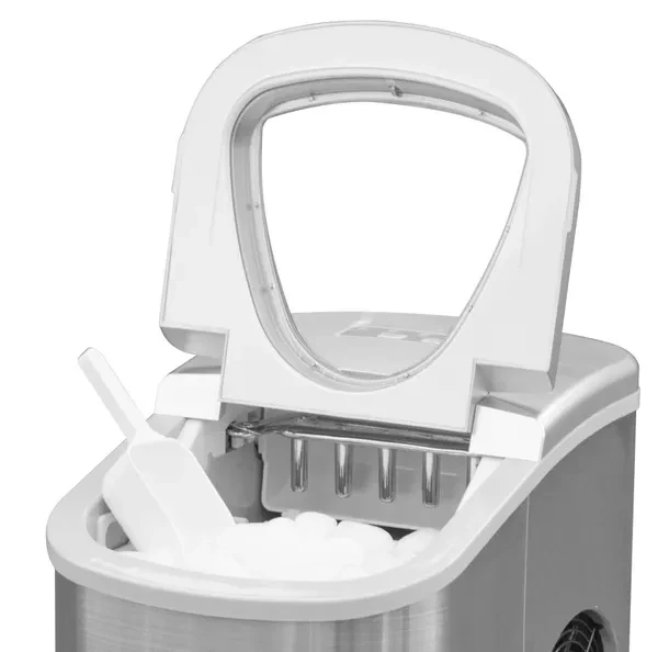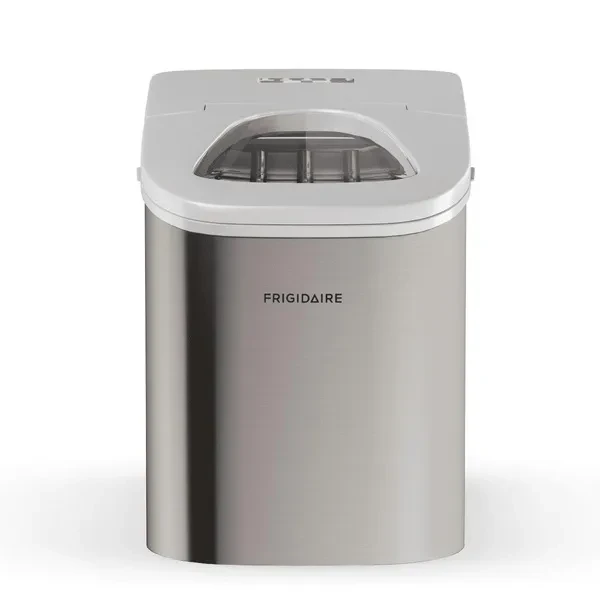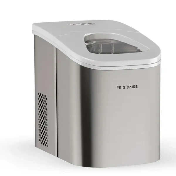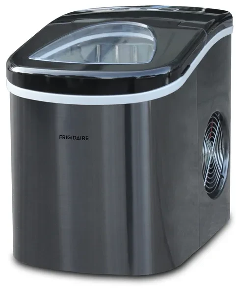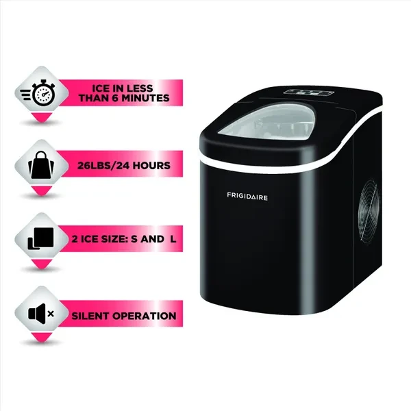 Always have fresh ice on hand with the superior ice making abilities Top Ice Maker! Designed to make 26 pounds of ice in 2 different sizes, this handy counter top appliance is sleek and compact, and can store 1.5 pounds of ice at a time! Featuring bright LED indicators, and a large see-through window so you can easily monitor ice levels, the Frigidaire Counter Top Ice Maker is ideal for use all year round, for large parities, or for use in a dorm room. Makes 26 lbs. of ice in 24 hours ensuring that you will always have ice available Extremely quiet design runs at less than 38 decibels means your party music will never be over shadowed by your ice maker Store up to 1.5 lb. of ice in the interior basket Inside reservoir holds 2.3 quarts of water. Led display and simple to use electronic controls makes operating your ice maker a breeze Fast ice produces 9 cubes of ice every 7-15 minutes so you will always have a cold drink ready to go This cabinet will compliment any decor Large see-through window allows you to see inside the ice maker without opening the lid An ice shovel is included to easily remove the ice in a clean and sanitary manner A convenient drain plug allows you to drain and clean your ice maker quickly and safely Weight: 19.14 lbs