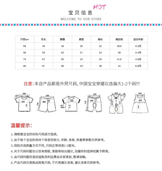 WELCOME - Quality is the first with best service. customers all are our friends. - Fashion design,100% Brand New,high quality! - Material: 100% Cotton - Color: As shown in the pictures - Listing Includes: Two-Pieces Outfits - Sizes: 70/80/90/100 Cm Size Chart: Size Recommended Age Measurement (Cm) Romper Length Bust 70 0-2 Months 49 49 80 2-4 Months 53 52 90 4-6 Months 57 55 100 6-8 Months 61 58 Size Recommended Age Measurement (Inch) Romper Length Bust 70 0-2 Months 19.29 19.29 80 2-4 Months 20.87 20.47 90 4-6 Months 22.44 21.65 100 6-8 Months 24.02 22.83 There is 2-3% difference according to manual measurement. please check the measurement chart carefully before you buy the item. 1 inch = 2.54 cm Please note that slight color difference should be acceptable due to the light and screen. What You Got: 1 x Romper & 1 x Hat