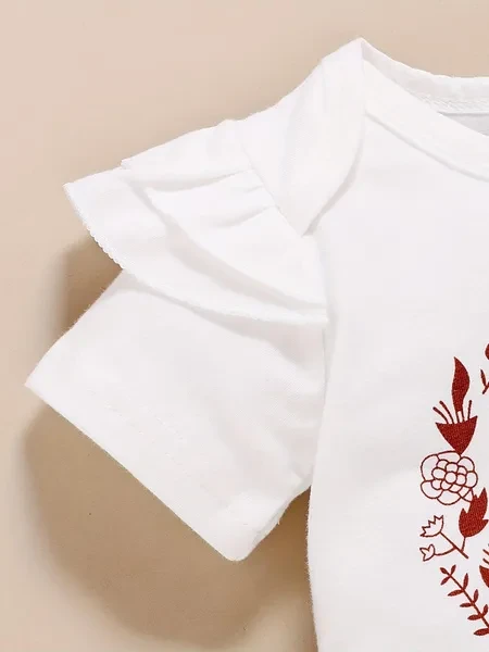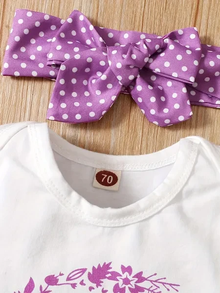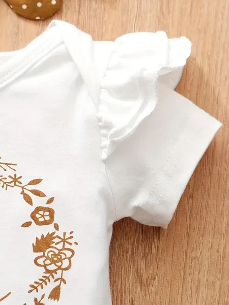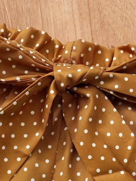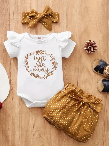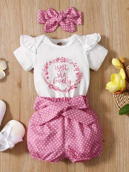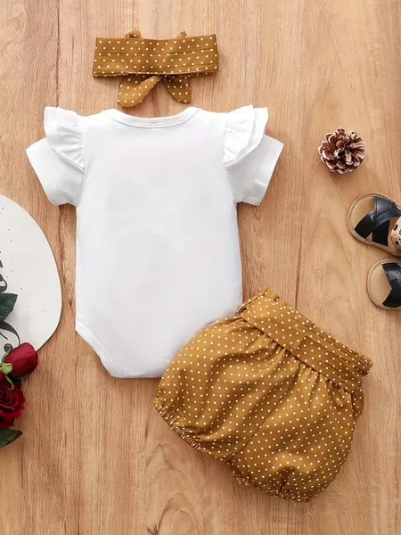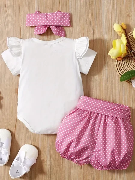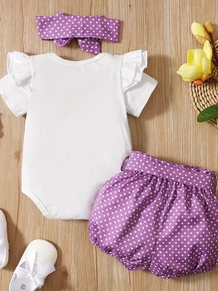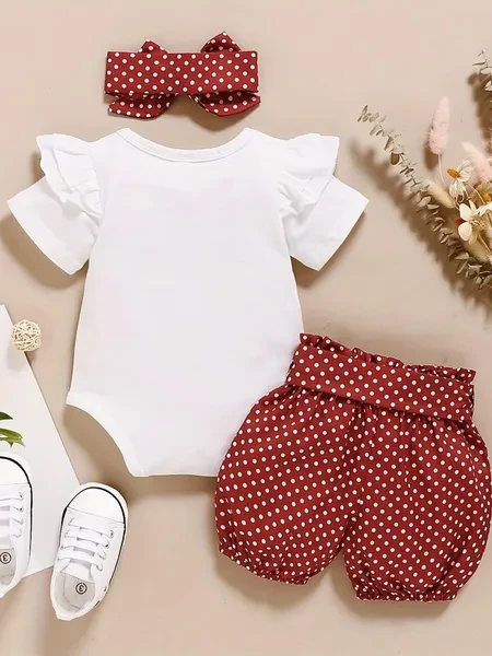 3pcs Baby Girls Cute Short Sleeve Ruffle Trim Onesie & Polka Dot Belted Shorts & Headband Set, Cotton Casual Clothes