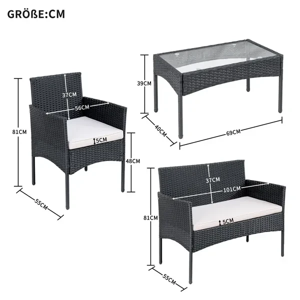 description POLYRATTAN-ROBUST, WEATHER-RESISTANT, HIGH UV-RESISTANT AND EASY-CARE. Polyrattan is weatherproof and withstands central European weather conditions. The tear- and tensile-resistant material easily withstands rain, high temperatures and intense sunlight. This means that poly rattan keeps its beautiful color for years. In addition, dirt cannot penetrate the fibers and therefore only sits superficially. Thus it is very easy to care for. The braid can be easily kept clean with a damp cloth and mild detergent. COMFORTABLE SEAT CUSHION - The 5 cm thick seat cushions allow you to sit softly for hours. The pillow is removable and the pillowcase is washable. Elegant side bands ensure that the pillow keeps its shape. The soft surface cloth offers a smooth finish and great feel. The simple pillowcases can be easily removed thanks to the concealed zippers and cleaned at 30 degrees.