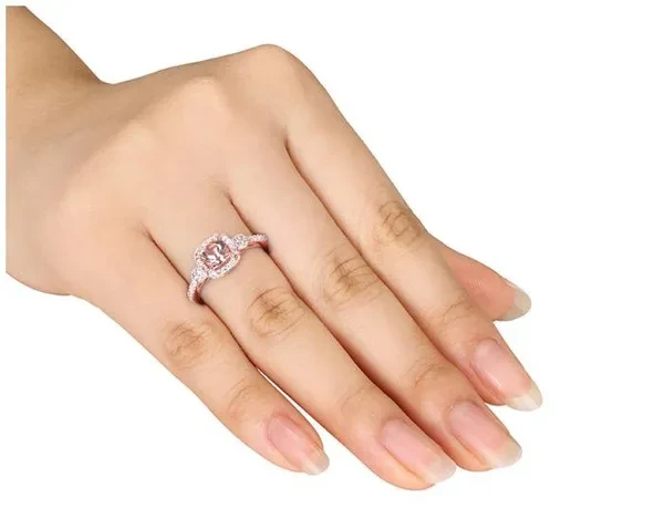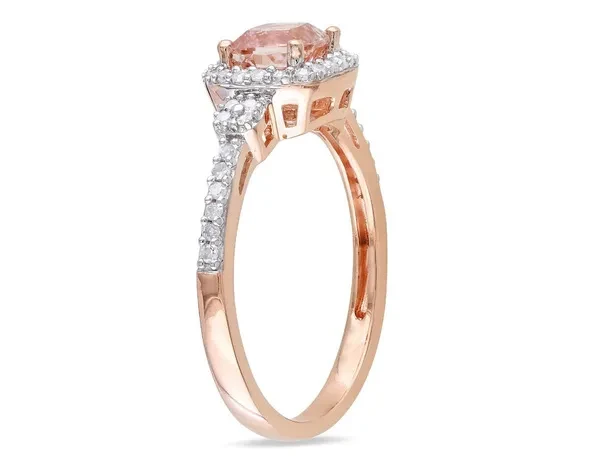 4/5 Carat (ctw) Diamond and Morganite Ring in 10K Rose Pink Gold A pink Morganite gem glows from the center of this splendid square halo ring. Glittering white diamonds cascade down the 10 karat rose gold band, bringing the total gem weight to a glamorous 0.80 carats (ctw). Beautifully crafted in 10k rose gold with a Polished Finish Stone Type: Morganite; Color: Pink; .6 CTW; Quantity: 1; Cushion Cut; Cushion Shape; Natural; Prong Setting Stone Type: Diamond; Color: G-H; Clarity: I1-I2; 0.20 CTW; Brilliant Cut; Round Shape; Natural; Prong Setting This item ships in signature jewelry box packaging, ready for gift-giving with a classic, elegant look and feel This Diamond Ring is the perfect gift for any birthday, anniversary, holidays, thank you, thinking of you, or for any reason at all SKU: 08DLG43118MO-P