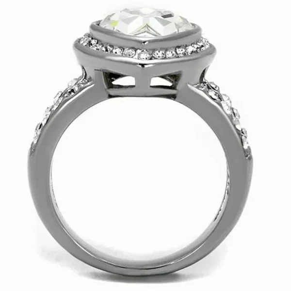 This beautiful high polished AAA grade pear cut crystal halo engagement ring is Amazing! Made of solid stainless steel with a high polished finish (no plating). This ring features a 5.41 carat (14mm x 10mm) pear cut solitaire stone in a bezel setting, alongside 30 (1.5mm) round cut stones in a paved setting to form a halo, and 16 (2mm) pave set stones on the band. The total carat weight is approx. 6.34 diamond equivalent. This ring has Top quality stones and displays amazing enriched clarity just like real diamonds! Stainless Steel jewelry is durable, hypo-allergenic and will not tarnish or oxidize over time. Details Metal Type: Stainless Steel Tusk 316 Finish: High polished (no plating) Size: 5, 6, 7, 8, 9, 10 Gemstone: Top Grade Crystals Center Stone Carat Weight: 5.41 Total Carat Weight: 6.34 (approx.) Stone Color: Clear Cut: Pear / Round Brilliant Setting: Bezel / Pave Ring Width: 18mm(top), 8.3mm(band at widest point) Approx. Weight: 7.61 grams