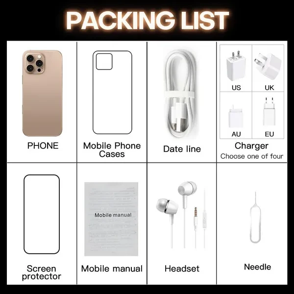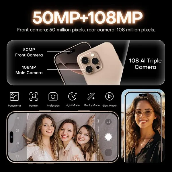 Factory direct sales, better quality but lower price is our target and mission! Feature: - 7.3inch FHD Display The i16proMax delivers the viewing experience you always wanted, With a massive 93% screen-to-body ratio on a 7.3"inch screen. - 50MP Front Camera Clear and Stylish Selfie The i16proMax world-leading 50MP front camera turns your every selfie into a work of art experience greater brightness, color vibrancy, clarity and dynamic range. Even in the dimmest light, whenever you need it, your i16proMax is right there with you, capturing every moment with crystal-clear precision, Turn your selfies into masterpieces and shine in every photo. - 108MP Rear HD camera The i16proMax features a 108MP camera combination. The main camera sports a large f/1.8 aperture and 1.28um pixels, This strong combination boosts photo-sensitivity in backlight or low light, Just point and shoot, and i16proMax will make sure your pictures remain clear and bright. - Face Access The i16proMax also supports facial recognition upon activation,i16proMax scans your facial features and unlocks instantaneously accessing your phone has never been so easy, or so fun. - Powerful Performance The Snapdragon 8 gen2 mobile platform with 10mm process technology makes young people who love the young and other popular games. The game is on and lower. - Android 14.0 The new interactive design makes the operation simple and simple, the use of the mobile phone is so simple and straightforward, everything is handy. - Dual SIM card supports TF card Dual card dual standby, card slot does not distinguish between the main and the deputy, supporting the worlds 50 major communication carrier networks -Camera Button Camera Control gives you an easier way to quickly access camera tools. A high-precision force sensor with haptic feedback emulates the feel of a DSLR camera shutter. Recognizes precise interactions like clicks and slides. Specification: 1.Model No.:i16proMax 2.Platform : Snapdragon 8 gen3, Deca Core (Latest 10 Core) 3.Standby: Dual sim dual standby 4.Screen: 7.3HD+ Full Display 1440*3200 5.Speaker: 1511 Box Speaker 6.Frequency: GSM850/900/1800/1900MHz, 3G:WCDMA850/1700/1900/2100MHz *4G:TDD(B38\B40\B41),FDD (B1\2\3\4\5\7\8\20\28A\28B) *5G 7.Vibration: Support 8.Colors: Desert Titanium,Black Titanium,White Titanium,Natural Titanium 9.Memory: 16GB RAM+1TB ROM 10.Multi Media: MP3/MP4/3GP/FM Radio/Bluetooth 11.Camera: 50MP+108MP 12.Multi Function: Full screen, Face recognition, Dual SIM,2.4&5G Wi-Fi, GPS,Gravity Sensor, Alarm ,Calendar ,Calculator ,Audio recorder ,Video recorder, WAP/MMS/GPRS, Image viewer,E-Book,World clock,Tasks card, rear flash 13.Languages: Muti-language support 14.Others: Android OS 14.0 System 15.Battery: 8000mAh Lithium-ion battery 16.Ultra unibody 17.TypeC input Package Included: 1 x Smartphone, 1 x Charger Adapter, 1 x Headphones, 1 x User Manual, 1 x phone case, 1 x Protection film Attention: *In terms of memory and capacity, the actual available capacity will be reduced and different due to many factors: because the operating system occupies part of the memory (RAM), the actual available space is less than the marked memory capacity; due to the installation of the operating system and pre-installed programs occupy part of the flash memory (ROM), and the actual available storage space is less than the indicated flash memory capacity. *The mobile phone support GSM,WCDMA (For example USA  operators:T-mobile,AT&T,Straight Talk,Cricket Wireless,Google Project Fi,Lycamobile,MetroPCS ,MintMobile), whether to support 4G, 5G depends on the local operator networksupport,does not support the Telecom CDMA network. (For example USA  operators:Verizon,Sprint,U.S Cellular,Boost Mobile,FreedomPop,Ting),