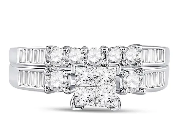 7/8 Carat (Color H-I, I1-I2) Princess Cut Diamond Engagement Ring Bridal Wedding Set in 10K White Gold Four square princess cut .35 carats (H-I, I1) diamonds sit at the center of this bridal wedding set, supported by sparkling brilliant round diamonds .35 carats (ctw H-I I1-I2) and flanked on either side by channel set baguette diamonds .20 carat (ctw) , this engagement ring and matching wedding band bridal set is crafted from striking crisp 10 karat white gold. Beautifully crafted in 10k white gold with a Polished Finish Stone Type: Diamond; Color: H-I; Clarity: I1-I2; 0.35 CTW; Quantity: 4; Princess Cut; Princess Shape; Natural; Invisible Setting Stone Type: Diamond; Color: H-I; Clarity: I1-I2; 0.35 CTW; Quantity: 6; Brilliant Cut; Round Shape; Natural; Prong Setting Diamond is the Birthstone for the Month of April This Diamond Engagement Ring is the perfect gift for any bridal engagement, birthday, anniversary, holidays, thank you, thinking of you, or for any reason at all SKU: 08GDG77491W-P