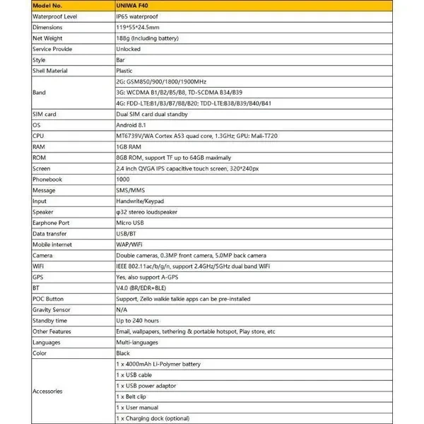 Band 2G: GSM850/900/1800/1900MHz; 3G: WCDMA B1/B2/B5/B8, TD-SCDMA B34/B39