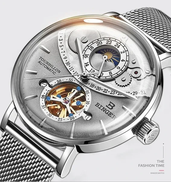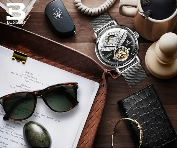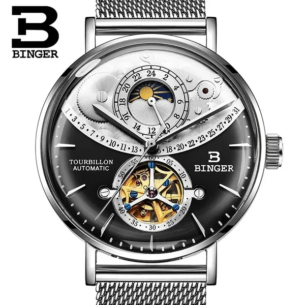 Automatic Watch Men BINGER skeleton Mechanical Mens Watches Fashion Brand Curved Mirror Relogio Masculino Waterproof