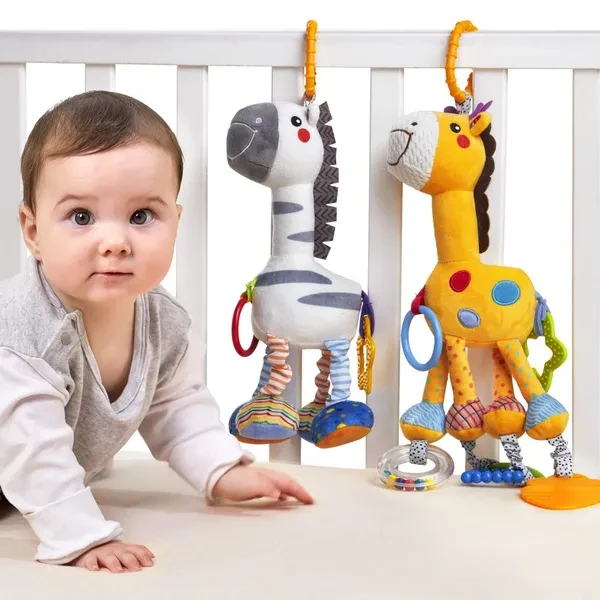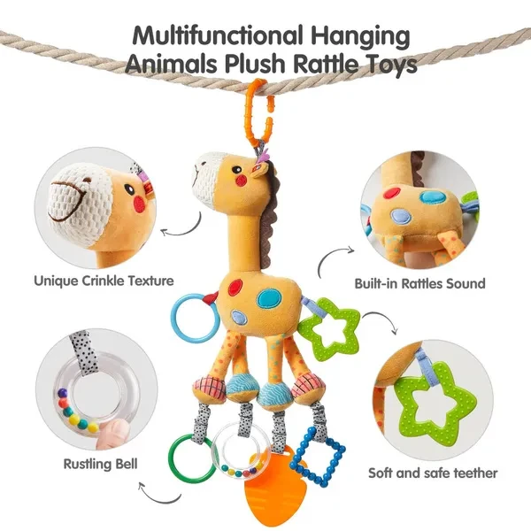 【Hanging Stroller Rattle Musical Toy】- Newborn Stroller Car Seat toy has a built-in wind chime and crinkles.It will make soft sound to attract your baby when shaking,and help parents to play with babies Whether at home or outside.Attract your baby's attention, enhance your baby's sensory stimulation, and baby's hearing development. 【Safe and Soft Fabric】- The baby toy is made of plastic ring hook+short plush, colorful, soft and skin-friendly fabrics, safety and non-toxic material,no harm for babies, infants can play without worrying about contact with toys to hurt them. 【Stimulate Visual】Lovely plush animal rattle with individual animal characters,high contrast colors,Lots of different textures to give baby maximum sensory experience,every car seat hanging toys can attract baby's attention easily and stimulate their visual development and develop baby's hand-eyes coordination. Encourages reaching and grasping. 【Car Seat Toys for Infants】- This toddler toy comes with a ring hook, which can be clipped to a stroller, car seat or crib, stroller toy, baby car seat toy, baby gym suspension toy, it is very easy to hang or remove. 【Gift for Newborn Toys】- This cute animal activity toy for newborn babies is perfect for newborn babies or baby boys or girls. Very meaningful and decent. 3-12 month old toys for babies, can be used as gifts for New Year, gifts, Christmas or Children's Day.