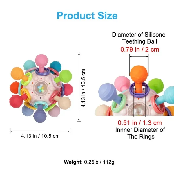 Multi-Sensory Baby Toy: This baby sensory toy uses 12 kinds of bright colors and textured silicone balls to stimulate baby’s senses. The rattle ring, twisting clicking ball and rotating ball also allow baby to have more sensory fun Silicone Baby Teether: This baby teether is made of high quality soft silicone and ABS plastic, which helps relieve gum pain and ensures the safety of your teething baby, great teething toys for babies 0-6 6-12 months Developmental Montessori Toys: Babies will be instantly drawn to this colorful and lightweight infant toy. Impact size designed for the little hands, encourage grasping and reaching to develop babies’ gross motor skills Essential Baby Travel Toy: Perfect size for tiny hands and easy to store in diaper bags. Relieve babies and keep them busy for a long time, an essential travel toy when baby is on the go, perfect for a car or plane trip Ideal Gifts for Newborns and Infants: This baby sensory toy is an ideal gift for baby Christmas stocking stuffers, baby showers, or birthdays. Perfect infant toys, newborn toys, and baby toys 0-3 3-6 6-12 months Product size: 4.13*4.13*2.76 inch / 10.5*10.5*7 cm, Product weight: 0.25LB / 112g, Inner diameter of rings: 13mm / 0.51 inch, Diameter of silicone teething ball: 20mm / 0.79 inch.