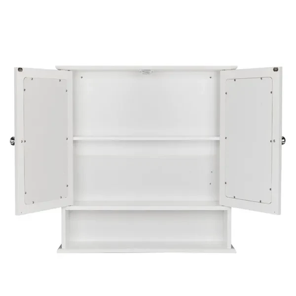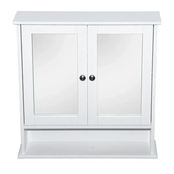Introductions: If you are looking for a cabinet to store your cutter, this Double Door Mirror Indoor Bathroom Wall Mounted Cabinet Shelf must be a good choice for you. It's fantastic for the bathroom or in any other room where you require some additional storage. Adopting high quality MDF material, it features smooth, stable and sturdy. With a mirror design, it's very convenient for use. Moreover, it's wall-mounted, which is space saving. With high quality and fine workmanship, it's worth buying! So don't hesitate, just take it home! Features 1. Made of high quality material, smooth, sturdy and durable 2. Waterproof, suitable for humid environment 3. It has a long service life 4. Wall-mounted, save space 5. Add some additional storage for you 6. Magnetic lock to hold doors shut 7. Convenient for use Specifications: 1. Material: MDF 2. Color: White 3. Dimensions: (22 x 5.1 x 22.8)" / (56 x 13 x 58)cm (L x W x H) 4. Weight: 13.23 lbs / 6 kg Package Includes: 1 x Double Mirror Bathroom Cabinet 1 x Manual