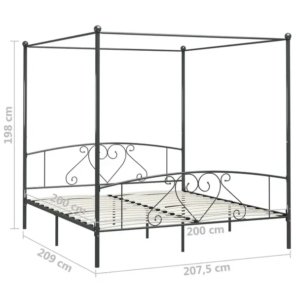 Create an elegant and classic look in your bedroom with our metal canopy bed frame! The bed is smartly designed with a top frame for hanging your favourite curtains, which adds a unique charm to your bedroom, while creating extra privacy. Made of solid metal, this bed frame is exceedingly sturdy and durable. With all these combined features, you will certainly have a good night's sleep! The bed frame needs assembly. Please note that the delivery includes a bed frame with a slatted base. A mattress is not included. You can check our shop for the matching mattresses. Colour: Grey Material: Metal Overall dimensions: 209 x 207,5 x 198 cm (L x W x H) Suitable mattress size: 200 x 200 cm (W x L) (mattress is not included)