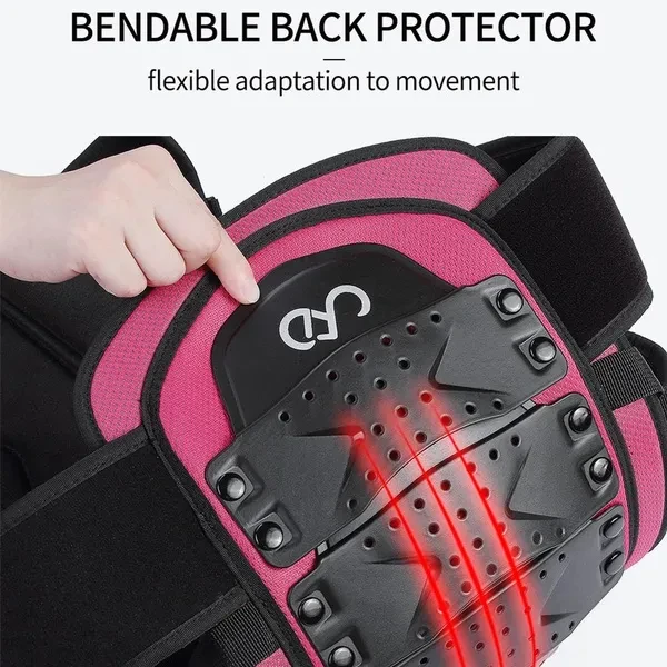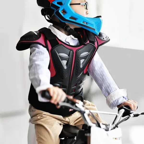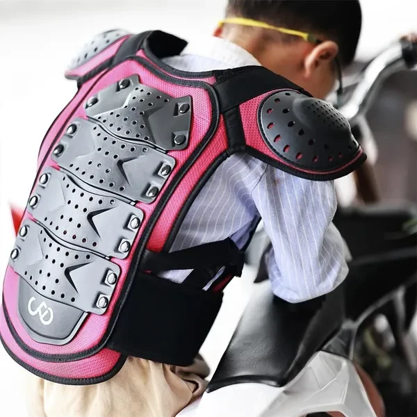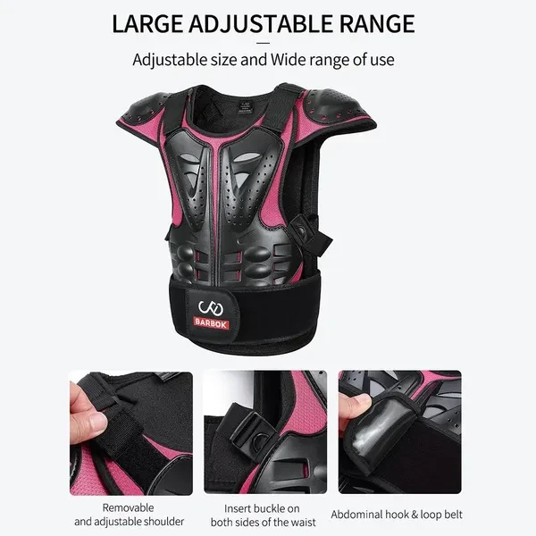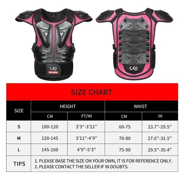Kids Body Armor Black, Rose S (height 100-120cm, waist 60-75cm, three pieces of armor at back) M (height 120-145cm, waist 70-80cm, four pieces of armor at back) L (height 145-160cm, waist 75-90cm, five pieces of armor at back) Fine wrapping around the collar Armor overall EVA filling, surface mesh design PE shell protection on shoulders, front chest and back, multiple small holes in the shell Plain fabric lining, soft and comfortable PE shell on the front chest built-in reflective cloth, night riding safety Detachable front and back armor, controlled by double Hook&Loop at shoulders and quick release buckle at waist The waist buckle press to pull out Hook&Loop on the shoulders and straps on both sides of the waist to adjust the tightness Sticky surface waist protection design to adjust the waist elasticity Waist guard with BARBOK leather logo not reflective, reflective logo at the bottom of the back Fit for children and teenagers Suitable for motorbike, cycling, roller, skateboarding, skiing, skating, etc
