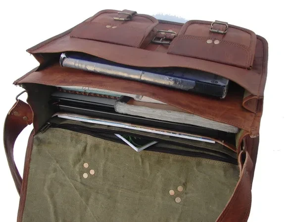 Material : high quality leather has an inner stitched canvas for durability. Laptop handmade padded sleeve included. Dimensions : (approx) 16" (H) x 12" (B) x 4.5" (W) (inch). Drop (54 - 57 inch / 127 cm adjustable sling). 60" adjustable shoulder strap made by goat leather hide Interior 2 zipper pocket as well as 3 huge compartment, Front 2 as well as side 2 pocket messenger bag Can be used as office bag has a partition for laptop two zippered pockets at inner front and rear laptop padded sleeve included Comes with brass polished buckles 100% Rust Free, Best Choice for 15" laptop office bag. For More Bag Visit My Store.