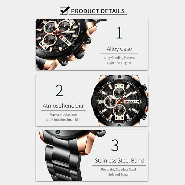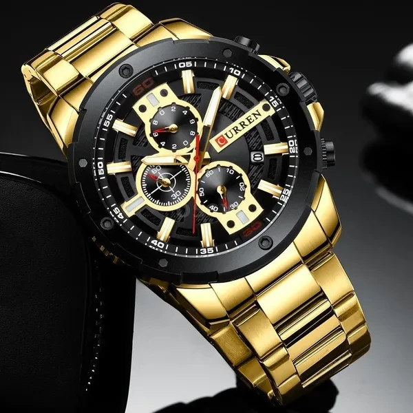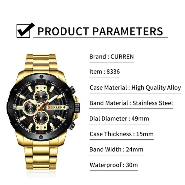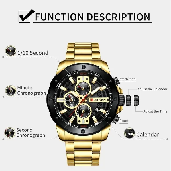 This is a Quartz Watch For Men, precise quartz movement for accurate time keeping. The watch is suitable for every occasion (outdoor, business, party), also a nice gift for family and friends. Features: Quartz movement provides accurate time. Multi-function such as chronograph second/minute, calendar. Made from alloy case and hard glass mirror, very durable. Easy to match well with your dress; could be decoration for your clothes. Suitable for various occasions like daily life, business meeting and so on. Amazing looking watch, a nice gift for your lover, relatives and friends and so on. Specifications: Brand: CURREN Color: Blue, Gold, Black, Silver (Optional) Case Material: Alloy Band Material: Stainless steel Band Length: 240mm/9.45in Band Width: 24mm/0.94in Dial Diameter: 49mm/1.93in Case Thickness: 15mm/0.59in Package Size: 150*30*20mm/5.91*1.18*0.79in Package Weight:165g/5.82oz Note: Due to the different display screen and light effect, the actual color of the item might be slightly different from the color showed on the pictures. Package List: 1*Quartz Watch