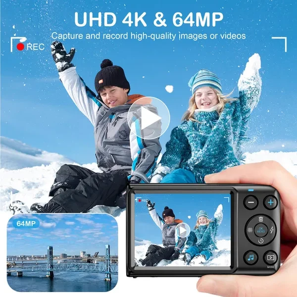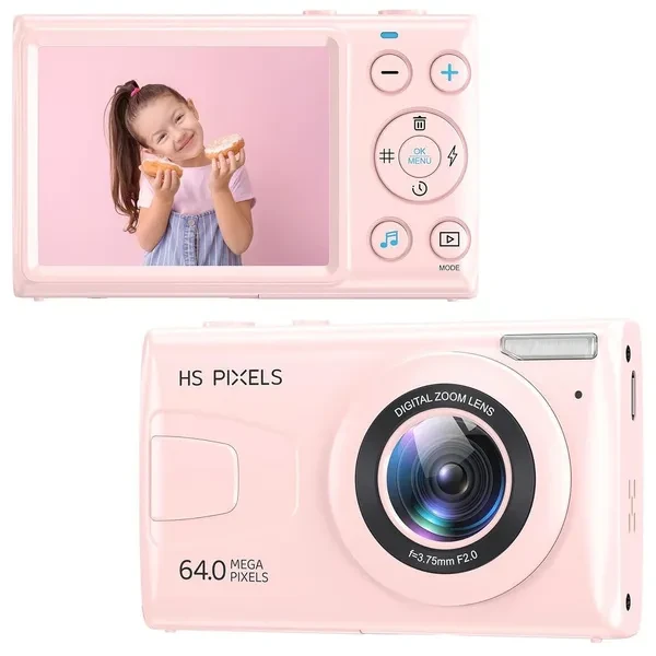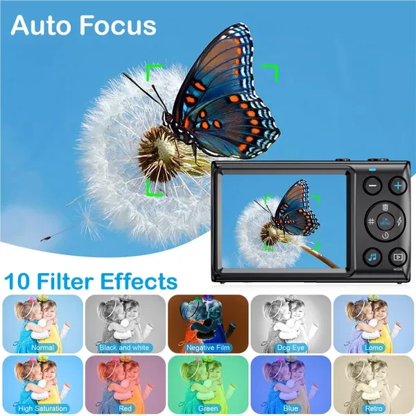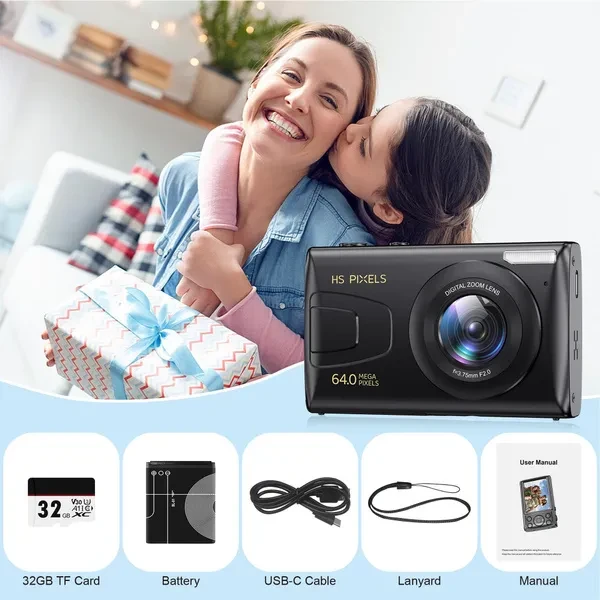 Description: ​?【Shoot Beauty with Easy】The kids digital camera captures high-clarity 4K videos and 64MP photos with a high-level CMOS sensor and Anti-Shake function.Let kids easily shoot the family warm picture. Simple to use, no need for complicated operation, only need to install the battery and ?SD card(NOT INCLUDED), switched it on within 2S. Tap the shutter, enjoy the fun of photography! ?【Combine Education with Pleasure】The camera for kids combine education with pleasure,the children can listen to music and memorise words while developing a hobby in photography.So why not buy one of these kids cameras to train a future photographer?(Tips:Plug in the Headphones Before Playing Music!) ?【Compact and Portable Camera】Special mini-size design for kids to easily handheld, this vlogging camera is small and lightweight, fits in kids' hands perfectly.The weight only 0.5 Lbs.Comes with a lanyard hang, it's portable for them to carry and move, and compact for travel and camp.Equipped with one high-capacity battery, solve the worries of travelling without electricity. ?【Explore More Ways to Play】The camera for photography is equipped with 10 filter modes and 18x digital zoom, so children can use their creativity to take photos according to their environment and needs. In addition, the camera is equipped with anti-shake, time-lapse, webcam and smile detection, etc.. Waiting for kids to discover! Package Includes: Camera * 1Battery * 1 USB Cable * 1 English Manual * 1 32G TF Card*1 Card Reader*1