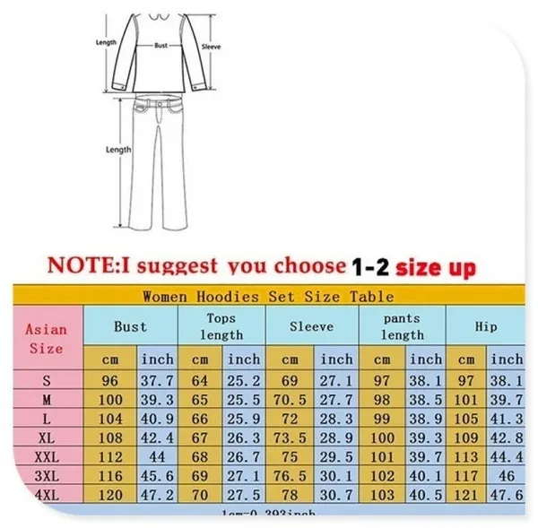 Welcome to our store, we will send your package within the scheduled time! Item: Women clothes Product Category: women hoodie Set Sleeve: Long sleeve Pants: Sport pants Size:S,M,L,XL,2XL,3XL,4XL Colors:black,gray,red,khaki Package included:1*hoodie + 1*pants 1.Our size table is based on actual product,please allow 1-3cm differs due to manual measurement. 2.Please measure your body correctly,and then refer to our detail size information to choose a suitable size. 3.You can go to my store to buy more perfect products. We have other type clothes in the store, welcome to shop!