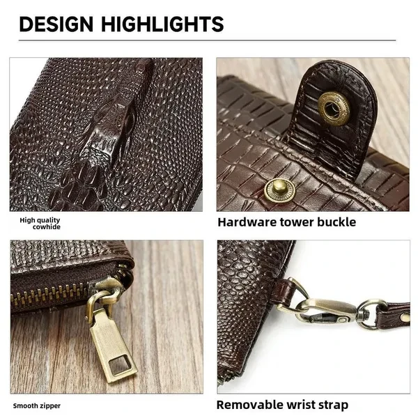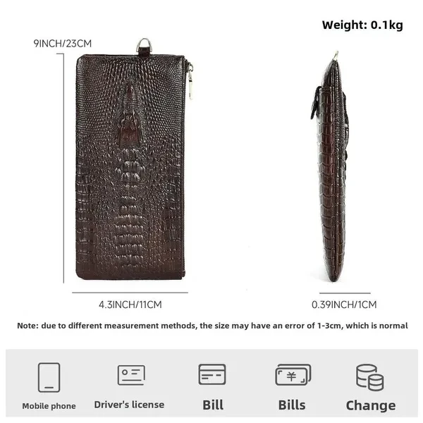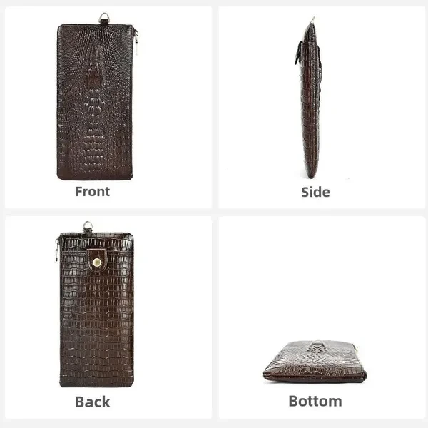 - **Premium Quality Material**: Crafted from genuine leather, this Genuine Leather Men's Crocodile Pattern Wallet offers exceptional durability and a luxurious feel, ensuring it withstands daily wear while exuding sophistication. - **Stylish Design**: The eye-catching crocodile pattern adds a unique touch to this long cowhide wallet, making it the perfect accessory for the modern businessman. Elevate your style with this versatile man purse that transitions seamlessly from casual to formal occasions. - **Ample Storage Capacity**: This multi-slot clutch bag is designed to hold all your essentials. With dedicated compartments for IDs, credit cards, and a cell phone, you can keep everything organized and easily accessible. - **Versatile Use**: Whether you need it for business meetings or daily errands, the Genuine Leather Men's Crocodile Pattern Wallet serves multiple purposes. It's not just a wallet; it’s a practical solution for everyday convenience and style. - **Satisfaction Guaranteed**: We are committed to providing high-quality products. Enjoy peace of mind with our dedicated customer service and hassle-free returns, ensuring your complete satisfaction with the Genuine Leather Men's Crocodile Pattern Wallet.