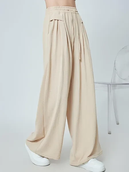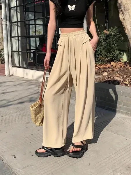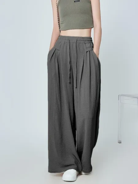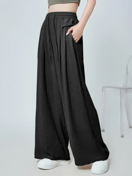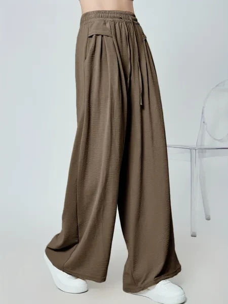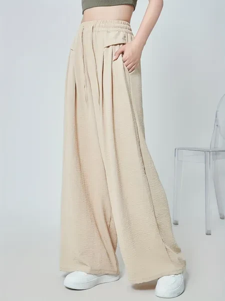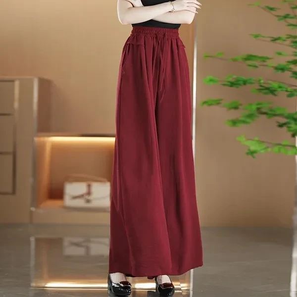 High Waist Slimming Nine-point Pants - Women's Solid Color Wide-leg Pleated Drawstring Pocket Long