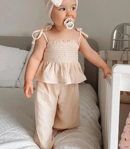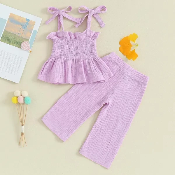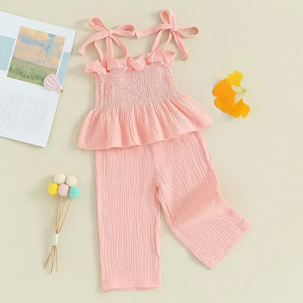 COMFORTABLE MATERIAL---The two piece toddler girls outfit is made of 95% cotton 5% polyester, soft and breathable, does not irritate your baby's delicate skin, Linen cotton. your baby will feel comfortable and cool in summer. CASUAL DESIGN--- Solid color, baby girl camisole top with sleeveless, bandage straps and ruffle hem design. Baby pants are designed with elastic waist for easy fit, your little girl will love such a cute outfit! PERFECT GIFT--- Newborn summer clothes for girls is is the perfect summer clothing set for your girl, suitable for birthdays, Christmas, Children's Day as a gift for your toddler girl. MANY OCCASIONS--- Baby girl pants set is perfect for kids daily casual wear, indoor and outdoor wear, vacation, school, travel, beach, wedding, party, photo shoots, etc. VERSATILE DESIGN--- Little girl summer clothes can be perfectly matched can be easily matched with jackets, shoes, backpacks, sun hats, it is a perfect outfit for summer.