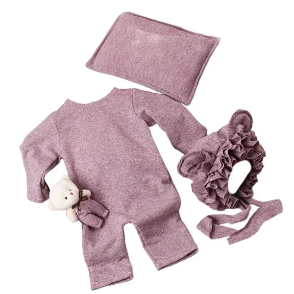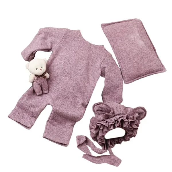 Infant Bear Toy with Ears Hat & Jumpsuit Outfit with Photo Props Pillow Soft Polyester Baby Outfit set Newborn Photograph