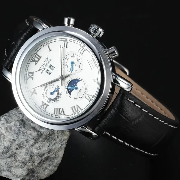 JARAGAR MoonPhase Design Calendar Display Black Leather Belt Men Automatic Wrist Watch Mechanical Montre Homme with Gift Box