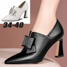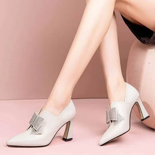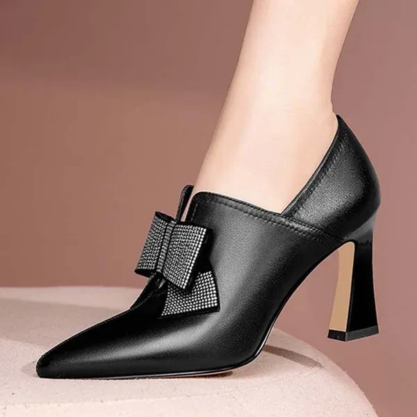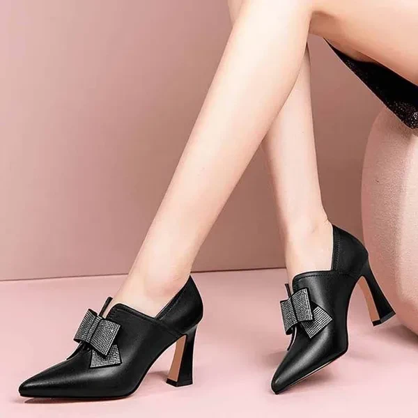 Ladies Black Dress Shoes Leather Ankle Boots Ladies Fashion High Heels Diamond Bow Boots 8Cm High Heels Pointed Toe Elegant Shoes Sapatos Femininos