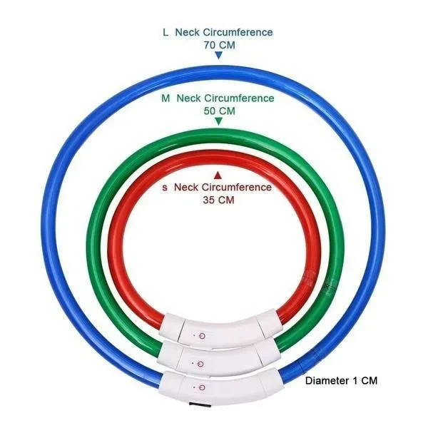 Welcome to our store~ Product Description: Item Type:Pet LED Collar Material:Silicone, ABS Color: Blue, white, red, orange, yellow, green, pink,multicolor Feature:Durable Target Audience:Dogs£¬Cats Size S length=35cm, Size M length=50cm, Size L length=70cm, Diameter(tube):1cm/0.39" Flash Mode:Flash, Slow Flash, Long Bright. Power:USB Package Include: 1 x pet collar Features: 1. Function: this product is suitable for pet to walk at night, and it has the function of safety warning. 2. Adjustable: the length of the pet silicone belt can be cut to adjust. 3. Charging Time: 30-40 minutes, with charging light instructions, and it will be out when being full. Luminescence time: flash 3-5 hours, often bright: about 2.5 hours. 4. LED: sufficient power, the visibility of the LED lamp can reach 500 meters.