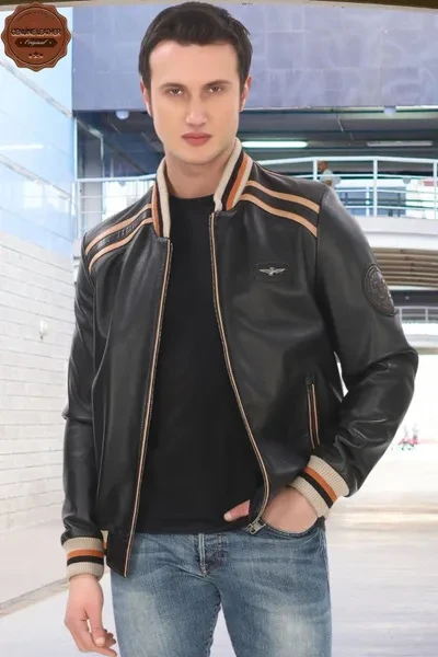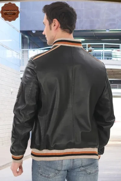 Upgrade your style. Genuine lambskin bomber jacket combines classic varsity fashion with modern touches. It will be indispensable in your wardrobe with its stylish and comfortable design. ✔️ Premium Quality: Made of 100% genuine lambskin, it makes a difference with its soft and luxurious texture ✔️ Stylish Design: Offers a sporty look with contrast stripe details on the collar, cuffs and hem ✔️ Comfortable Cut: Ribbed cuffs and waist provide a stylish stance that fits the body ✔️ Functional & Durable: Full zip closure and useful side pockets suitable for daily use ✔️ Versatile Use: You can use it comfortably in your daily combinations, special invitations or city walks This handmade leather jacket is the perfect combination of style and comfort. Make a difference in every environment with its timeless design. Size Chart: This jacket has a regular fit cut. For a more comfortable use, you can choose one size larger. S: Chest 108 cm M: Chest 112 cm L: Chest 116 cm XL: Chest 120 cm 2XL: Chest 124 cm 3XL: Chest 128 cm 4XL: Chest 132 cm 5XL: Chest 136 cm Important Information: All our jackets are handmade, so to ensure the best fit, please contact us after ordering to confirm your size measurements This genuine lambskin bomber jacket is the perfect choice for stylish men.