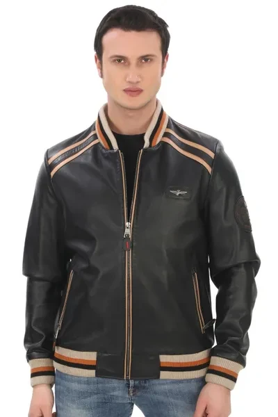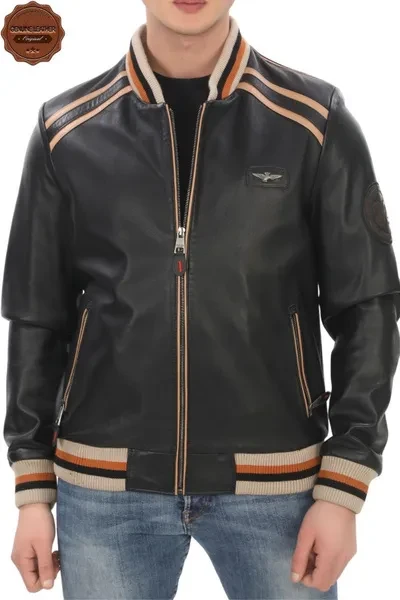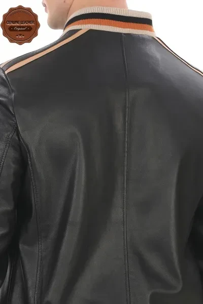 Men's Genuine Lambskin Bomber Jacket Stripe Detail Stylish Black Varsity Derimont Handmade Comfortable Jacket