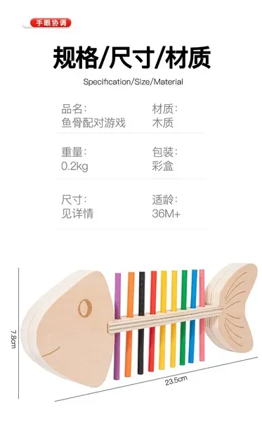 Name: Fish bone color matching game Materials:Wood Size:23.5*7.8cm Age:3+