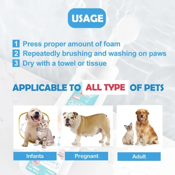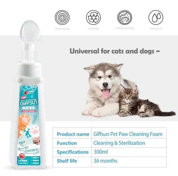 ★Introducing our Paw Foam Cleaner – a revolutionary solution for dedicated pet owners. Our innovative product provides a superior and gentle cleaning experience for both cats and dogs. ✔100% Natural Formular - Our on-the-go dog paw cleaner is enriched with moisturizing aloe vera, rosemary, and olive fruit oil, along with glycerin and coconut oil for a thorough yet gentle cleansing experience. As your pet's protector,it's formula leaves no residue, ensuring your furry friend doesn't experience discomfort or irritation. ✔The Press Pump design - at the core of our Paw Foam Cleaner creates dense foam with small molecular structures. This allows the foam to penetrate even the tiniest corners of your pet's paws, ensuring a thorough cleanse beyond the surface. Say goodbye to dirt, mud, and unwanted odors. ✔Waterless Paw Scrybber - This convenient mud buster makes paw washing easy anytime, anywhere.Ideal for on-the-go cleaning during travels and outdoor adventures, our portable paw cleaner. ✔Foam-Based Pet Paw Cleaner - The Press Pump design generates a concentrated foam that effectively reaches every nook of your pet's paws, ensuring a meticulous cleaning process. Our non-slip, non-stick formula, combined with a versatile brush head suitable for various paw and dog foot sizes, both small and large, underscores our dedication to prioritizing pet comfort in our design. Specifications: Type: Pet paw cleaning foam Suit for: Dog,Cat ( Extra-large, medium, and small dogs, as well as cats of all breeds, sizes, and ages) NET WT: 300ml Shelf life: 3 years Packing list: 1 x Pet Paw cleaning foam Choose our Paw Foam Cleaner – where innovation meets care, and your pet's well-being is our top priority. Elevate your pet care routine and indulge your furry friend in the luxury of a truly exceptional cleaning experience. Because every paw deserves the best.