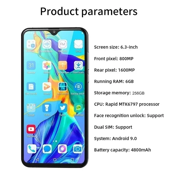 "Product Features: Model No:P30 Pro CPU: MTK6797 10 Core System: Android 9.1 ROM: 256 GB RAM: 6GB Screen Type: 6.3 inch full Touch Screen: Support Capacitive Resolution:1960*1080 pixels HD Screen Network: 4G Network mode: GSM/WCDMA Network: Dual SIM Cards Support T Card Camera type:Dual Rear Camera One Front Camera Camera Pixel: Front Camera:8 MP Rear Camera: 16.0 MP Software: Play Store, Air, Distance, Gesture, SmartWake, Calculator, Calendar, Alarm, Camera, Gallery Latest features:Face Unlock. Additional Product Features: GPS: Yes,Built in WiFi: Support 802.11 b/g/n wireless, support hotspot Bluetooth: Support Bluetooth 2.0 Sensor: Light sensor , Acceleration sensor , Direction sensor Message: MMS,SMS, Email, Gmail Audio Out Port: 3.5mm USB Port: Micro-USB2.0 Other Features : Play Store, Air Distance Gesture, Smart Wake, Calculator, Calendar, Alarm, Camera Gallery, Video Recorder, Audio Player, Sound Recorder ,FM Radio, Email, Gmail, Flashlight, etc GPS: Yes,Built in, Available language: Bahasa Indonesia, Bahasa Melayu, Catala, Cestina, Dansk, Deutsch, Eesti, English, Spanish, Filipino, French, Hrvastki, Italian, Latviesu, Lietuviu, Magyar, Nederlands, Norsk bokmal, Polski, Portuguese, Romana, Slovencina, Slovenscina, Suomi, Svenska, Viet, Turkish, Greek, Bulgarian, Russian, Cpnckn, Ykpaihcbka, Persian, Thai, Korean, Chinese, Japanese Package contents: 1 x Smartphone 1 x phone case 1 x Charger 1 x USB 1 x Earphone 1 x User Manual"