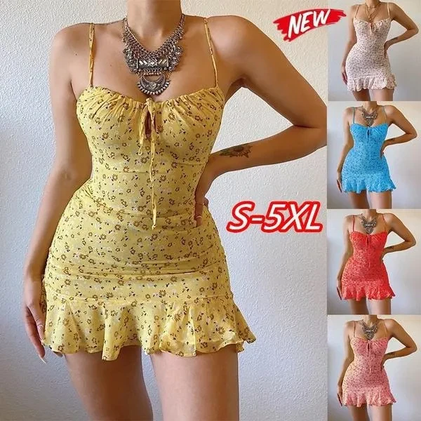 New Women's Fashion Floral Spaghetti Strap Mini Dress For Women Sleeveless Bodycon Dresses Floral Printed Summer Casual Dress Plus Size S-5XL