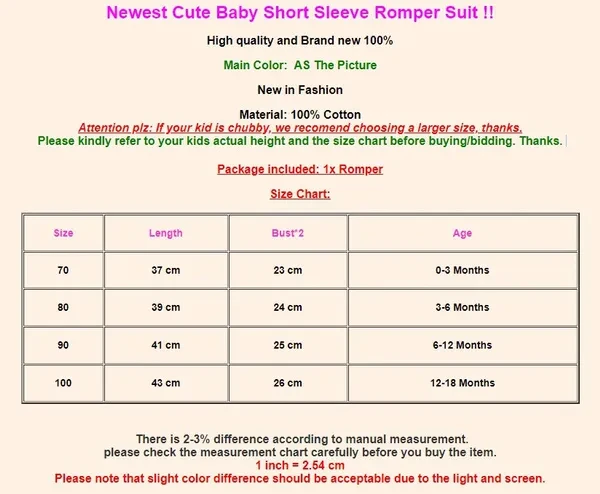 Newest Cute Baby Short Sleeve Romper Suit !! High quality and Brand new 100% Main Color: AS The Picture New in Fashion Material: 100% Cotton Attention plz: If your kid is chubby, we recomend choosing a larger size, thanks. Please kindly refer to your kids actual height and the size chart before buying/bidding. Thanks. Package included: 1x Romper Size Chart: Size Length Bust*2 Age 70 37 cm 23 cm 0-3 Months 80 39 cm 24 cm 3-6 Months 90 41 cm 25 cm 6-12 Months 100 43 cm 26 cm 12-18 Months There is 2-3% difference according to manual measurement. please check the measurement chart carefully before you buy the item. 1 inch = 2.54 cm Please note that slight color difference should be acceptable due to the light and screen.