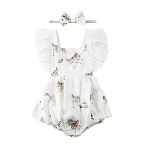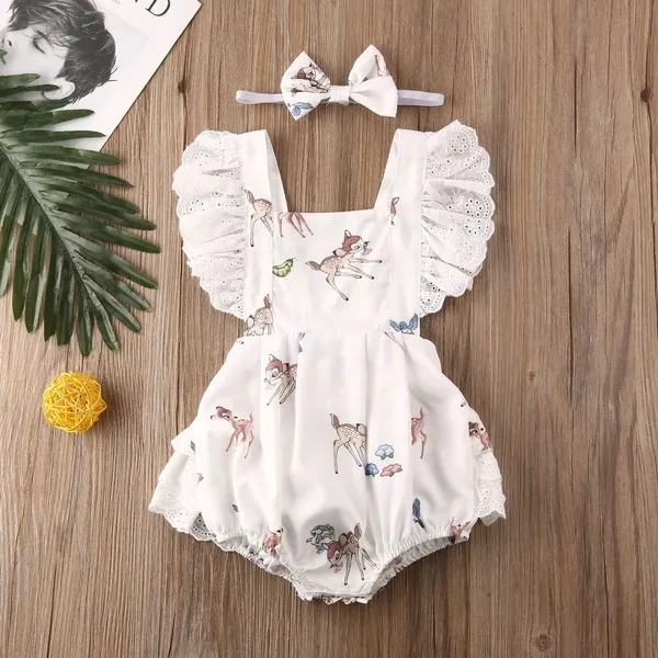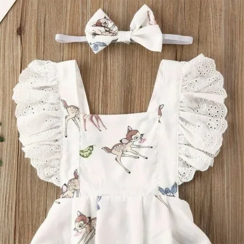 Newborn Infant Baby Girl Clothes Ruffle Lace Deer Print Romper Bodysuit Jumpsuit + Headband Outfits Set