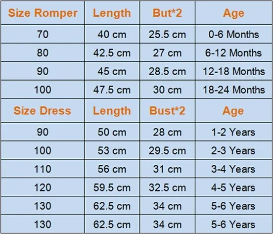 Newest Fashion Baby Girls Romper Dress !! High quality and Brand new 100% Main Color: AS The Picture New in Fashion Material: Cotton Blend Attention plz: If your kid is chubby, we recomend choosing a larger size, thanks. Please kindly refer to your kids actual height and the size chart before buying/bidding. Thanks. Package included: 1x Romper / 1x Dress Size Chart: Size Romper Length Bust*2 Age 70 40 cm 25.5 cm 0-6 Months 80 42.5 cm 27 cm 6-12 Months 90 45 cm 28.5 cm 12-18 Months 100 47.5 cm 30 cm 18-24 Months Size Dress Length Bust*2 Age 90 50 cm 28 cm 1-2 Years 100 53 cm 29.5 cm 2-3 Years 110 56 cm 31 cm 3-4 Years 120 59.5 cm 32.5 cm 4-5 Years 130 62.5 cm 34 cm 5-6 Years