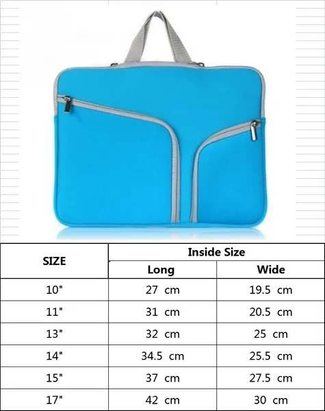 Notebook laptop Sleeve Case Carry Bag Pouch Cover For 11 13 15 17 MacBook Air/Pro, edges and zipper,Waterproof feature Fits your Macbook perfectly Prevent Your Laptop PC from Scratch, Shock and Stain Waterproof breathable, Soft and Comfortable Can be Repeated Cleaning, Easy to Dry Suitable for macbook 11'' 13" 15'' 17" specification Material:Neoprene Color:Sky blue, Rose red, Purpler, Black, Light green Style: Fashion Closure Type: Zipper Applicable Models: Macbook Gender: Unisex Size(LxW):10"(27x19.5cm), 11"(31x20.5cm), 13"(32x25cm), 14"(34.5x25.5cm), 15"(37x27.5cm), 17"(42x30cm), Package Included: 1x Laptop bag