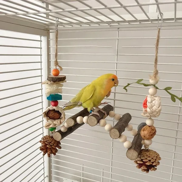 <p>Features: Are you still worried that your bird will get bored at home?? These are what your little furry friend want--Pet Bird Toy Set! For Small and Birds. Suitable for parakeets parrots cockatiel budgies. Wood branch helps exercise bird feet. Wide space between forks allows bird comfortable relax place. Parrots stand perch provides excellent feet exercise. It gives your bird comfortable controlled grip that conditions and massages your bird feet. Specifications: Material: Wood,Metal,Pinecones Bridge Size: Approx.20x27cm/7.87x10.63inch Package Includes: 1 Set Bird Swing Toy(3 PCS) note: 1.Please allow 1-2cm errors due to manual measurement, make sure that you do not mind before you order. 2.Due to the difference between different monitors, the picture may not reflect the actual color of the item. </p>