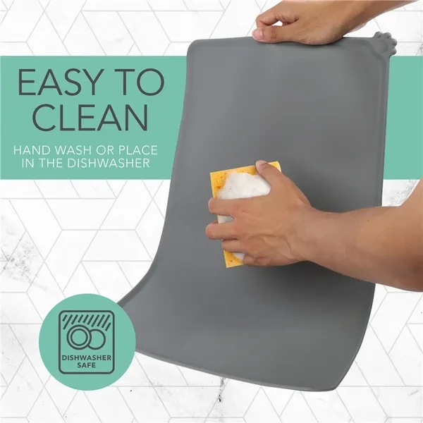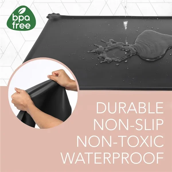 Durable Material: Our dog and cat feeding mat is made of nontoxic hypoallergenic silicone material that is BPA free, flexible, durable, and does not contain any harmful chemicals. No Mess: The dog food tray has a raised lip around the outer rim of the mat to allow for easy lifting. Grippy silicone surface helps keep bowls in place. Perfect Size: Each tray is 18.5” x 11.5” and provides the perfect space for puppy bowls. The mat grips the floor and will remain stationary where placed. The grippy top side has slightly raised pebbles to grip and hold bowls in place. Easy to Clean: Just rinse and wipe. Air dry or wipe dry quickly. Also dishwasher safe. Soft and flexible silicone material makes it easy to roll up to store, or pack for travel. Anti-Slip Design: Anti-skid surface design prevents dog bowls from sliding when your pet is eating. Keeps the mess associated with eating to a confined space.