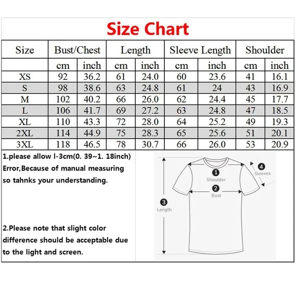 Tops Type: T Shirt Collar: O-Neck Style: Casual Material: Cotton Sleeve Style: Regular Sleeve Length: Short Package included: 1pcs* shirt (all the accessories are not included) (Dear customer's attention: because there will inevitably be a bit of offset printing on the clothes when printing, it is not dirty at all, it can be easily removed by washing with water, and will not affect the appearance of the whole clothes) It may have error 1-3cm normal range because everyone measuring way different from measurement tool will be slightly different with the size of the label. The real color of the item may be slightly different from the pictures shown on website caused by many factors such as brightness of your monitor and light brightness when photo taking.