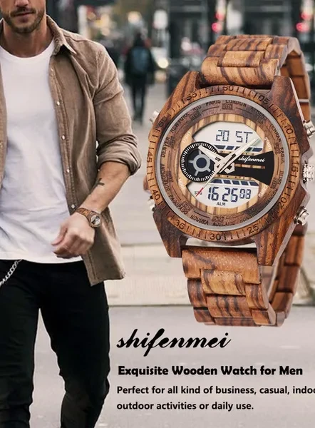 Brand Name: shifenmei Style: SPORT Clasp Type: Folding Clasp with Safety Water Resistance Depth: No waterproof Movement: QUARTZ Movement: Dual Display Case Material: Wooden Band Length: 21.5inch Dial Window Material Type: Glass Case Thickness: 15mm Band Width: 21.5mm Case Shape: ROUND Item Type: Quartz Wristwatches Boxes & Cases Material: Wood Model Number: Shifenmei Band Material Type: Wooden Feature: Stop Watch Feature: Back Light Feature: LED display Feature: Repeater Feature: luminous Feature: Chronograph Feature: Water Resistant Feature: Alarm Feature: Week Display Feature: Luminous Hands Dial Diameter: 51mm Watche Type: Men watch fashion sport watches Watches Style: Sport watch shock resist Watch Design: Wood watch men Gender: Dual Time Digital Watch for Men Suitable for: Business,casual,indoor activities or daily use Function: Digital Watch Men Top Luxury Brand Function1: Men Sport Casual Led Watches "Package included: -1 * Watch. -1 * Gift Box. -1 * Manual Instruction. Please give us a five-star feedback if you are satisfied with our products and service.