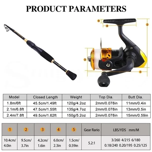 Package List: 1 * Fishing Rod 1 * Fishing Reel 1 * 100M Fishing Line 1 * Fishing Float 1 * Fishing Bell 3 * Soft Lures 5 * Connector Fishing Accessories 5 * Fishing Line Sinker Slides 5 * Fishing Rubber Bobber 1 * Box Fishing Hooks(different size) The Spinning Fishing Rod Specifications: Type:Rock Fishing Rod,Spinning Fishing Ro Material:Carbon Fiber Length:180cm 210cm 240cm Sections:7/8/9 Top Diameter:2mm/0.078in Butt Diameter:12mm/0.47in 13mm/0.51in 13cm/0.51in Closed Length:47.5cm/1.55ft 48.5cm/1.59ft 51cm1.67ft Weight:103g/3.6oz 122g/4.3oz 146g/5oz Notice: Due to the different monitor and light effect,the actual color maybe a slight different from the picture color. Please allow 2-3cm differs due to manual measurement. The Fishing Reel Features: 1.3pieces of ball bearing, gear ratio 5.2:1. 2.ABS spool with high-tensile gear. 3.Fully adjustable cast control with sound. 4.Excellent line lay oscillation system. 5.With nylon line reel, making fishing more convenient and more favorable Specifications: Item weight: 154g / 5.4oz Line capacity (mm/m): 0.18/245, 0.2/200, 0.25/125 Line capacity (lb/yd): 5/219, 6/137, 8/96