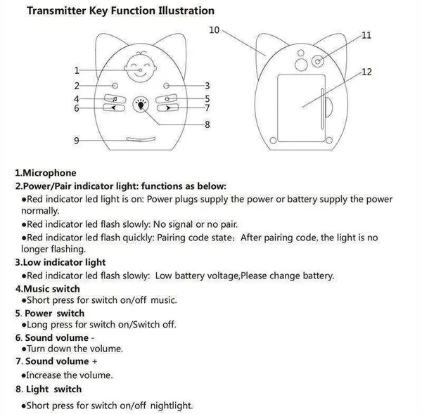 Specification: Model Number: V30 Connection Type: Wireless Operating frequency: ISM 905-925MHz Transmission power: 10 dBm Modulation mode: FSK Spread spectrum method: FHHS Audio encoding: ADPCM Modulation frequency: 180 KHz Code rate: 500 Kbps Receiver sensitivity: ≦-92 dBm Power supply mode: 5V USB or 3pcs AA dry battery Transmitter operating current: 180 mA MAX (all open) Transmitter standby current: 75 mA MAX Receiver operating current: 75 mA MAX Battery specifications: 3pcs 1.2V AA dry battery Operating Temperature: 0°C-50°C Packing list:1 x Baby Unit, 1 x Parent Unit, 1 x AC adaptor for baby unit, 1 x AC adaptor for parent unit, 1 x English Manual (Batterise is not included) Main Features: *2.4GHz digital wireless transmission, stable transmission signal. *Built-in MIC and speaker for two-way audio monitoring. *High sensitivity, the crying voice is easy to be heard and the lamp will turn on to inform parents. *Easy pairing, plug and play in. *Position the transmitter at a distance of about 1.5-2.0 meters from the baby. *Both parent unit and baby unit can be powered by DC 5V or 3*1.5V AAA battery. *Volume adjustment *Two-way intercom, support for data encryption *Both the receiver have built-in microphones and speakers *Open space transmission range up to 250M