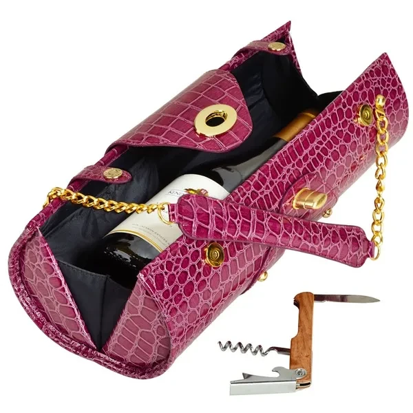 <p> One of a kind high quality wine carrier that double as a clutch or evening cocktail purse. Great for parties and nights out on the town, these attractive hard sided purses safely carry one bottle of wine or champagne. They also feature a padded interior with attractive lining and a small inside pocket to neatly carry the included corkscrew. High end design details and construction make this an excellent fit for any occasion. </p>
