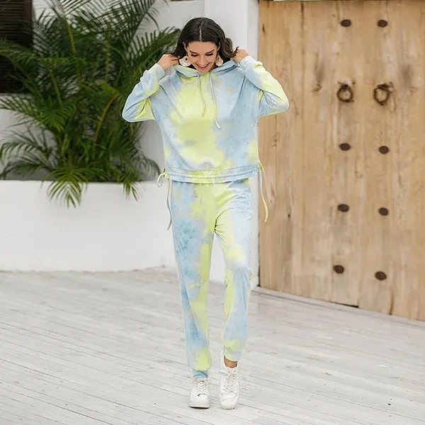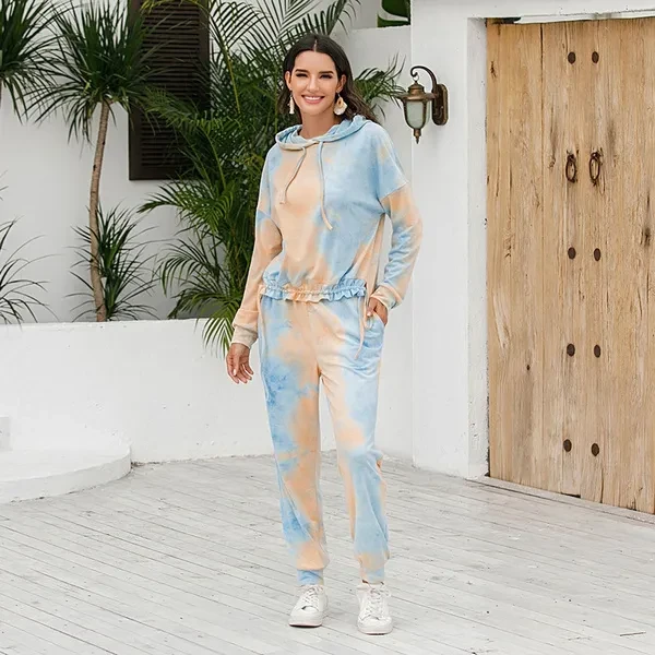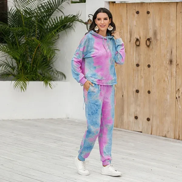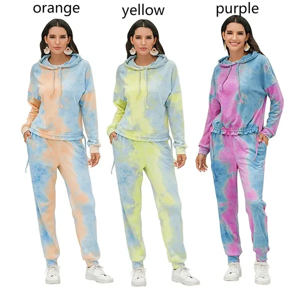 Women Tie Dye 2 Piece Outfit Drawstring Hoodie with Jogger Sweatpants Tracksuit YVO