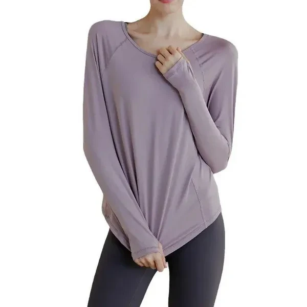 product category: T-shirt function: Moisture-wicking gender: Female pattern: Solid color season: Autumn fabric: Polyester fiber blend fabric composition: 90% polyester, 10% spandex sleeve length: Long sleeve fit: Regular wearing method: Pullover length: Waist-length scene: Fitness, body shaping lining: Polyester fiber blend • Slimming design creates a flattering silhouette, perfect for women who want to look and feel their best during workouts • Breathable and moisture-wicking fabric blend keeps you cool and dry, even during intense exercise sessions • Loose fit and long sleeves allow for unrestricted movement, making it ideal for running, yoga, and a variety of fitness routines • Quick-dry technology ensures sweat is rapidly wicked away, maintaining comfort throughout your workout • Versatile for spring, summer, and autumn outdoor activities, offering year-round practicality and comfort