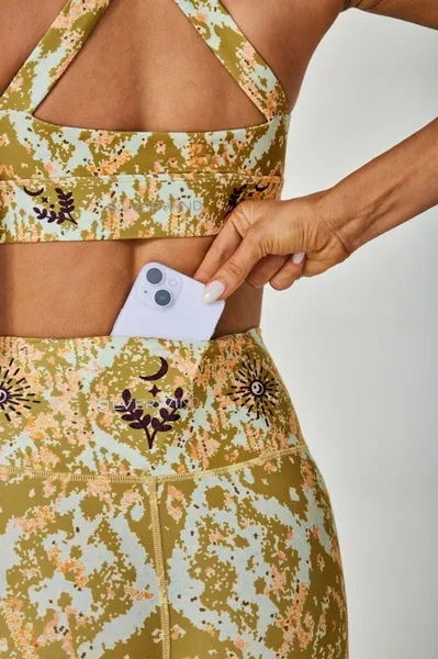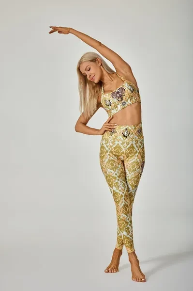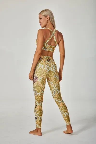 Pattern Description: The 'Jubar' print showcases a golden backdrop embellished with Native American geometric patterns, complemented by symbolic elements including elephants, the moon, plants, and gemstones. These symbols all convey themes of wisdom and enlightenment. The elephant, moon, and gemstones symbolize inner brilliance and intellect. The ‘Jubar print is designed to assist you in connecting with your inner wisdom during meditation or yoga sessions, allowing you to tap into your strength. Product Features: High-waisted design perfectly shapes, supports and flatters any body types No small elastic band at the top A hidden pocket at the back No side seams for extra flattering fit and comfort Pair it with our matching Jubar Square Neck Bra for a totally unique and dreamy look Fabric: Made with 84% RPET and 16% spandex from recycled plastic bottles and it is 100% recyclable! - Four-way stretch, breathable and anti-bacterial. Model Info: Natali // Height: 5'7  // Bust 34.3” //  Waist 24.4” // Hips 36.6 // SILVERWIND size Regular S  Poli // Height: 5'7 // Bust 33.5” // Waist 23.6” // Hips 35” // SILVERWIND size Regular S